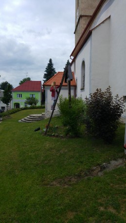 Velký misijní kříž s umělecky obnoveným korpusem ukřižovaného Ježíše Krista na plechu před farním kostelem v Horní Plané
